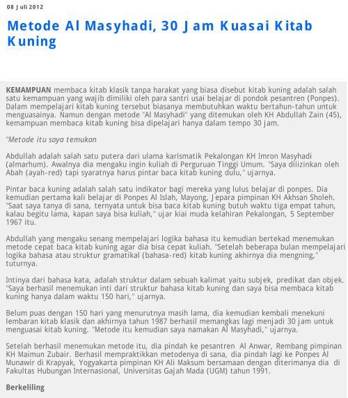 Metode Al Masyhadi, 30 Jam Kuasai Kitab Kuning - Kliping Berita