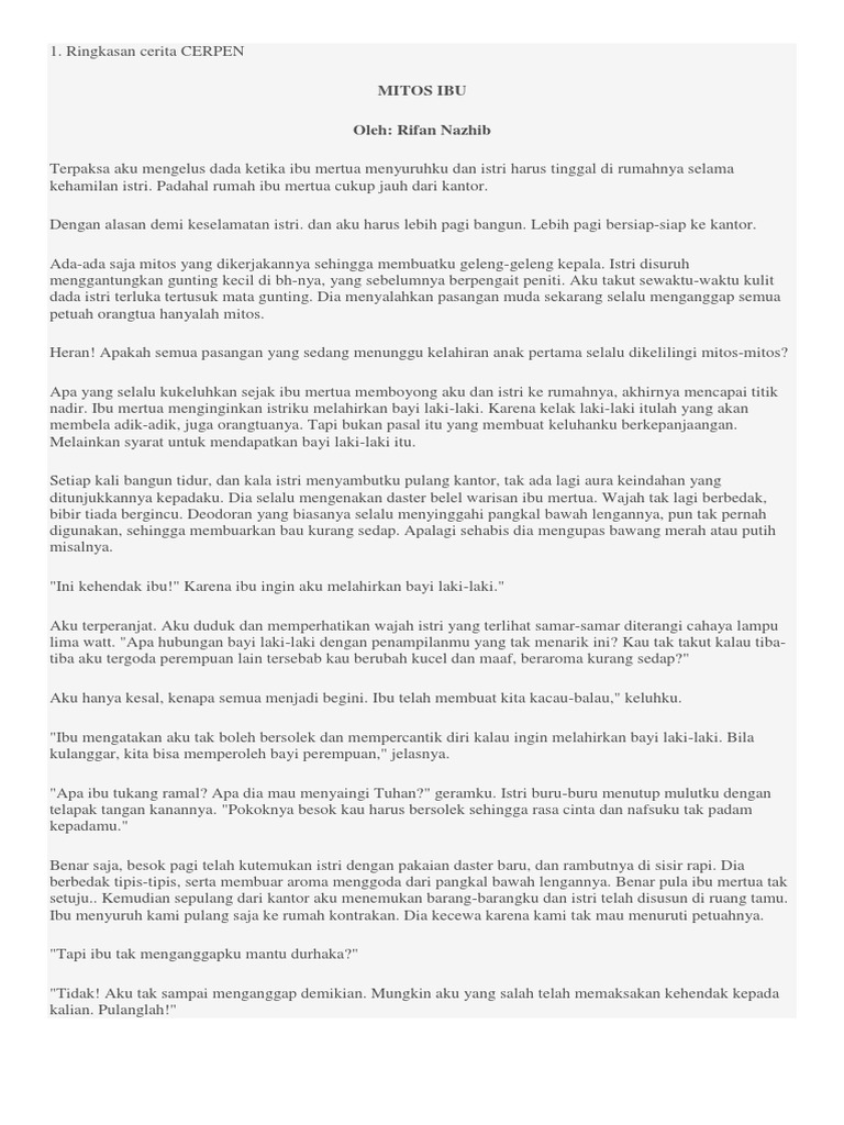 Tugas 3 MERESENSI CERPEN.docx - CERPEN MITOS IBU Oleh Rifan Nazhib Terpaksa aku mengelus dada ketika ibu mertua menyuruhku dan istri harus tinggal di | Course Hero