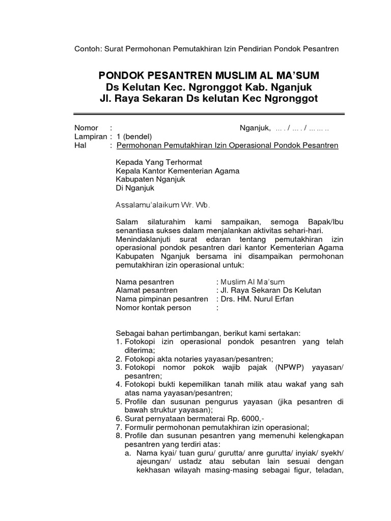 CONTOH PERMOHONAN IZIN OPERASIONAL PONDOK PESANTREN - husnuls492.com