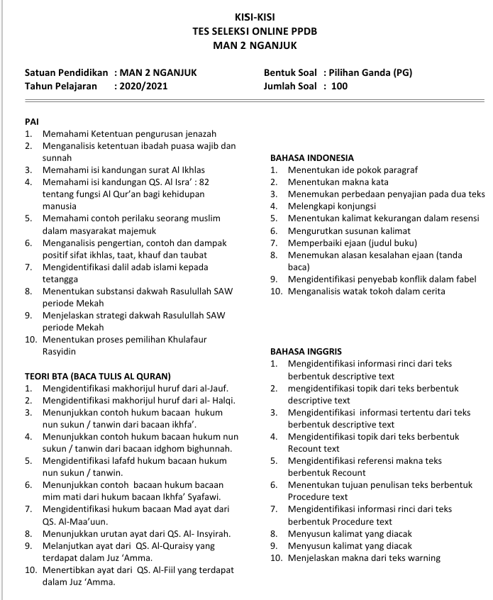 KISI-KISI TES SELEKSI ONLINE PPDB MAN 2 NGANJUK 2020 ~ MAN 2 Nganjuk - Jawa Timur - Indonesia