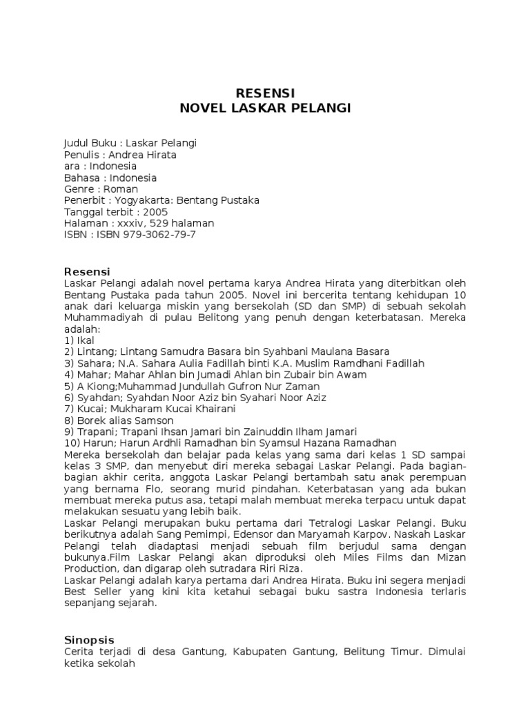 DOC) Contoh Resensi Novel Laskar Pelangi Sinopsis Novel Laskar Pelangi Novel ini menceritakan tentang sepuluh anak Belitung yang tergabung dalam Laskar | Annissa Ari Mukti - Academia.edu