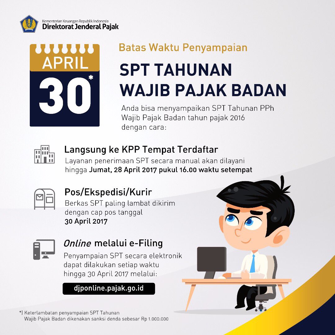 PajakKitaUntukKita sur Twitter : “Batas waktu penyampaian SPT Tahunan Badan adalah 30 April 2017. Pengumuman lengkapnya silakan klik tautan berikut : https://t.co/Sdb6BwyaDJ… https://t.co/93PTgXvTfc”