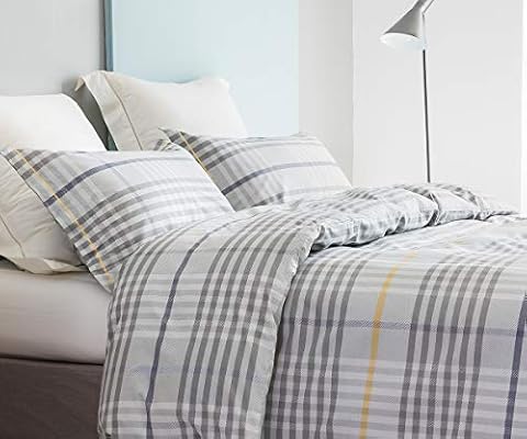 SLEEPBELLA Duvet Cover King, Grey and Blue Plaid with Yellow Embroidered Flange Cotton Comforter Cover, 3 Pieces Bedding with 1 Duvet Cover (No Comforter Insert), 2 Pillow Shams: Amazon.sg: Home
