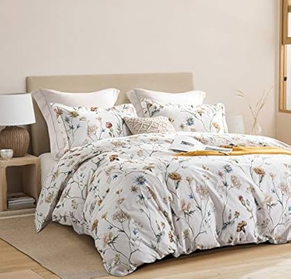 SLEEPBELLA Duvet Cover Queen, Yellow & Blue Flowers Printed on Off-White with Goldenrod Embroidered Flange, 3 Pieces Cotton Comforter Cover with 1 Duvet Cover (No Comforter Insert), 2 Pillow Shams: Amazon.sg: Home