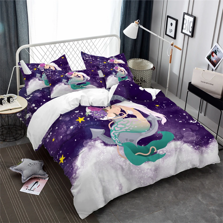 Ungu Biru Kartun Set Tempat Tidur Putri Duyung Selimut Penutup Set Anchor Print Bed Cover Putri Seprai Sarung Bantal Home Tekstil 3Pcs|Set tempat tidur| - AliExpress