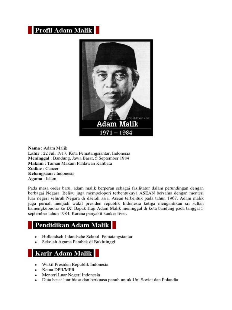 Biografi Dan Profil Lengkap Adam Malik Wakil Presiden Ke-3 RI – Pelopor Terbentuknya ASEAN – Info Biografi