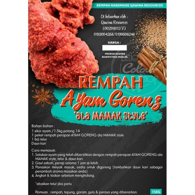 Added by @dapor.mami Instagram post REMPAH AYAH GORENG TANDOORI Berat: 90gm(cadangan untuk 1ekor ayam) Harga: RM8 (tidak termasuk postage) Bahan2: Tepung beras, tepung jagung, biji ketumbar, bawang putih kering, cili kering, serbuk