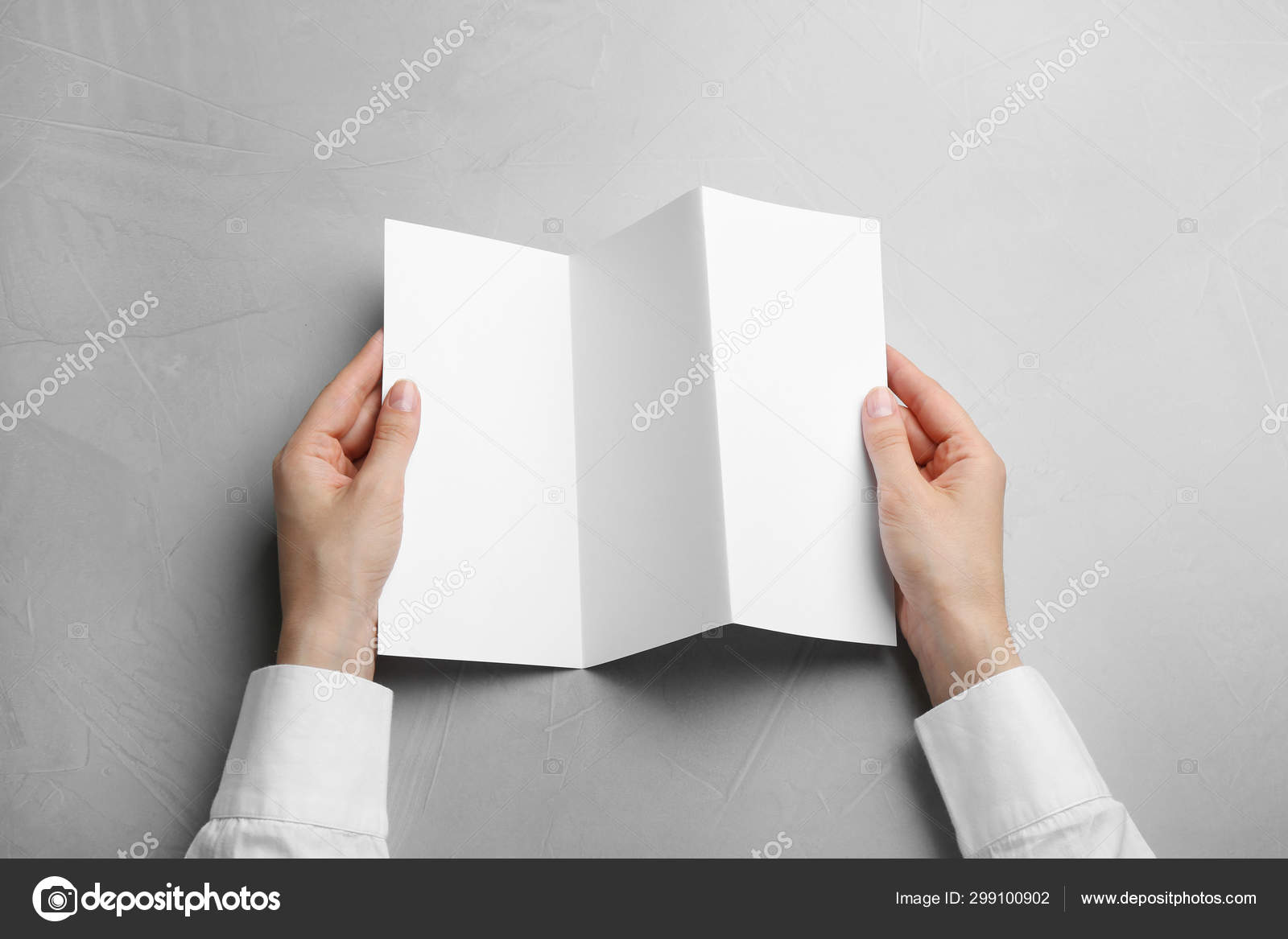 Young woman holding blank brochure at grey table, top view. Mock up for design — Stock Photo © liudmilachernetska@gmail.com #299100902