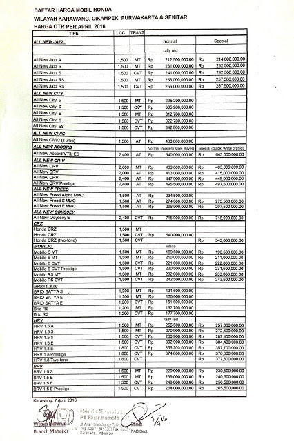 INFO HONDA BANDUNG: Harga Otr Mobil Honda Bandung November 2016