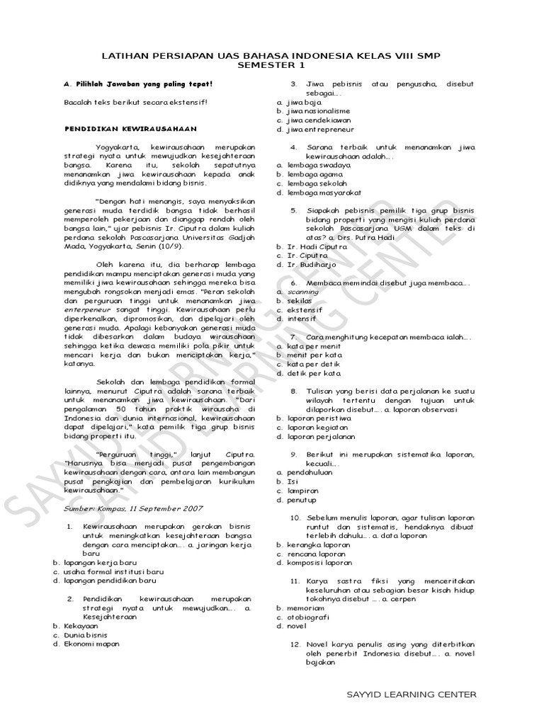 Latihan Persiapan Uas Bahasa Indonesia Kelas Viii Smp Semester 1