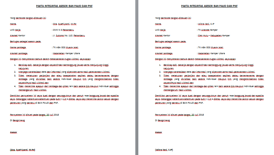 Contoh Pakta Integritas Asesor BAN PAUD dan PNF ~ Secercah Ilmu