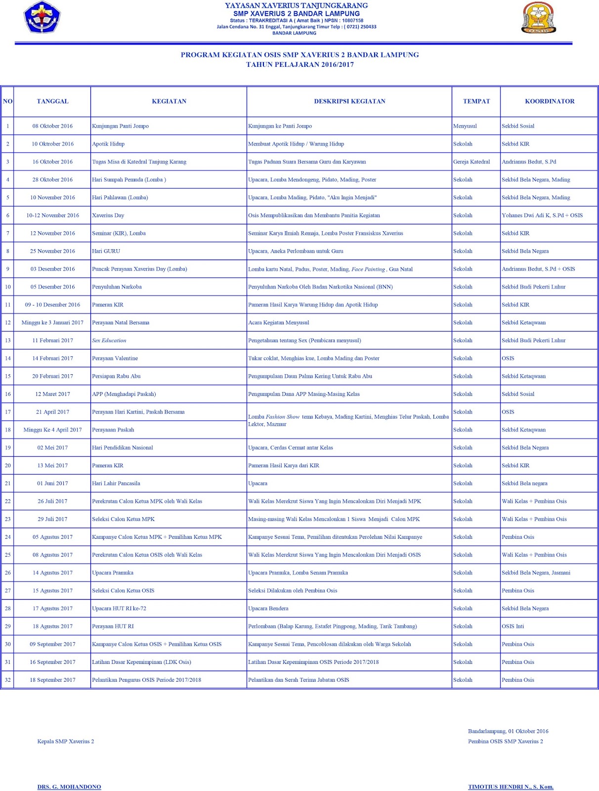 Jadwal Kegiatan OSIS SMP XAVERIUS 2 2016/2017 ~ OSIS SMP Xaverius 2 B.L