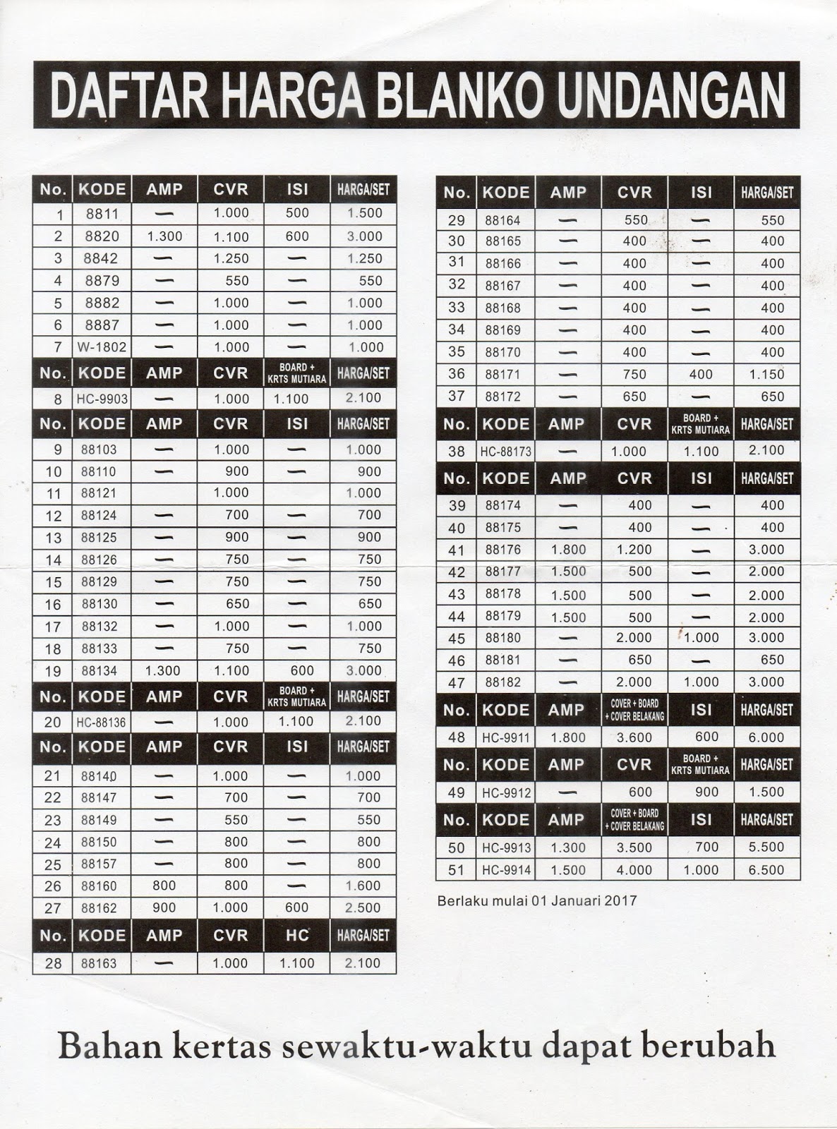 Daftar Harga Undangan Blangko Era Baru 2016 ~ Percetakan BEKASI PRINTING