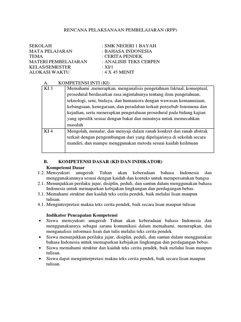 Rpp Bahasa Indonesia Xi Teks Cerpen