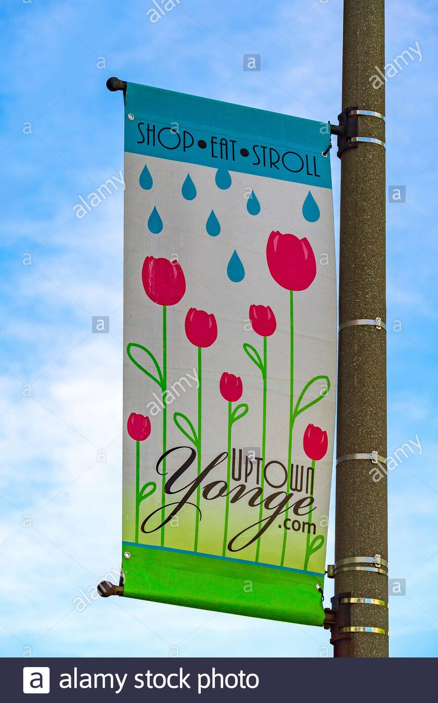 Uptown Yonge advertisement flexi banner on pole. Uptown Yonge is an eclectic mix of international retailers, local boutiques, fine dining, local pubs Stock Photo - Alamy