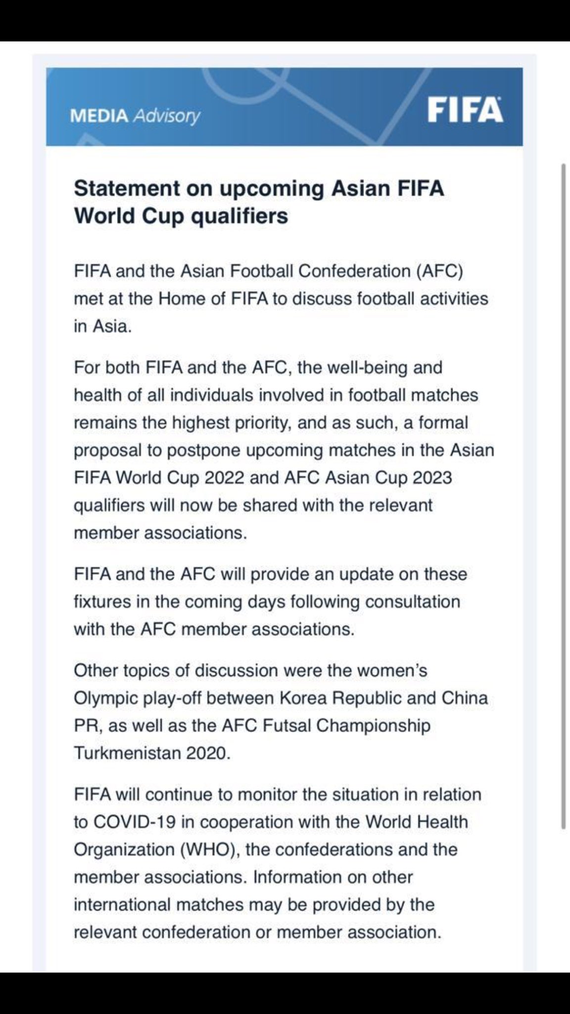 Asian World Cup qualifiers face postponement over virus: FIFA