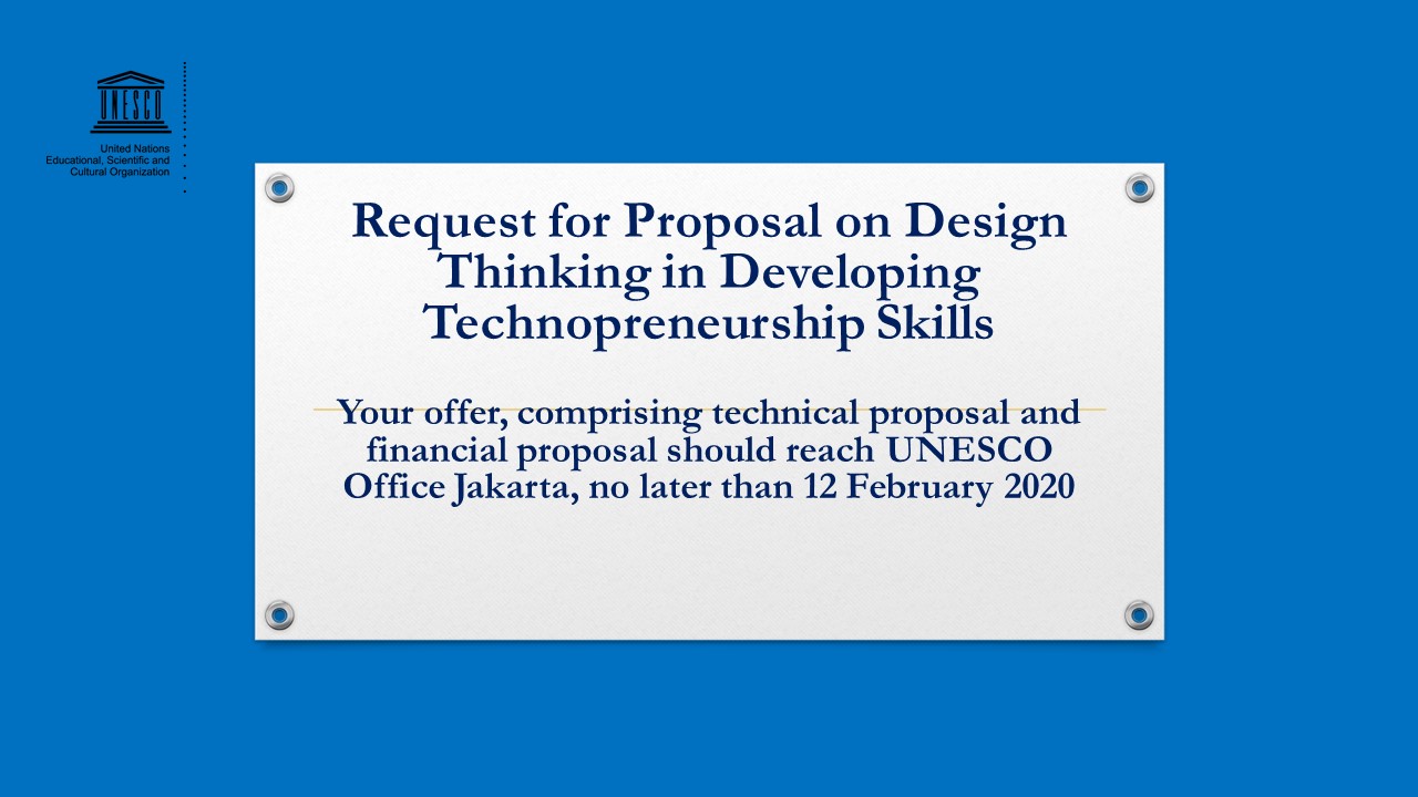 UNESCO Jakarta on Twitter: “Request for Proposal on Design Thinking in Developing Technopreneurship Skills https://t.co/Aml7cYxxGX Closing date 12 February 2020… https://t.co/qpC09EuVBh”