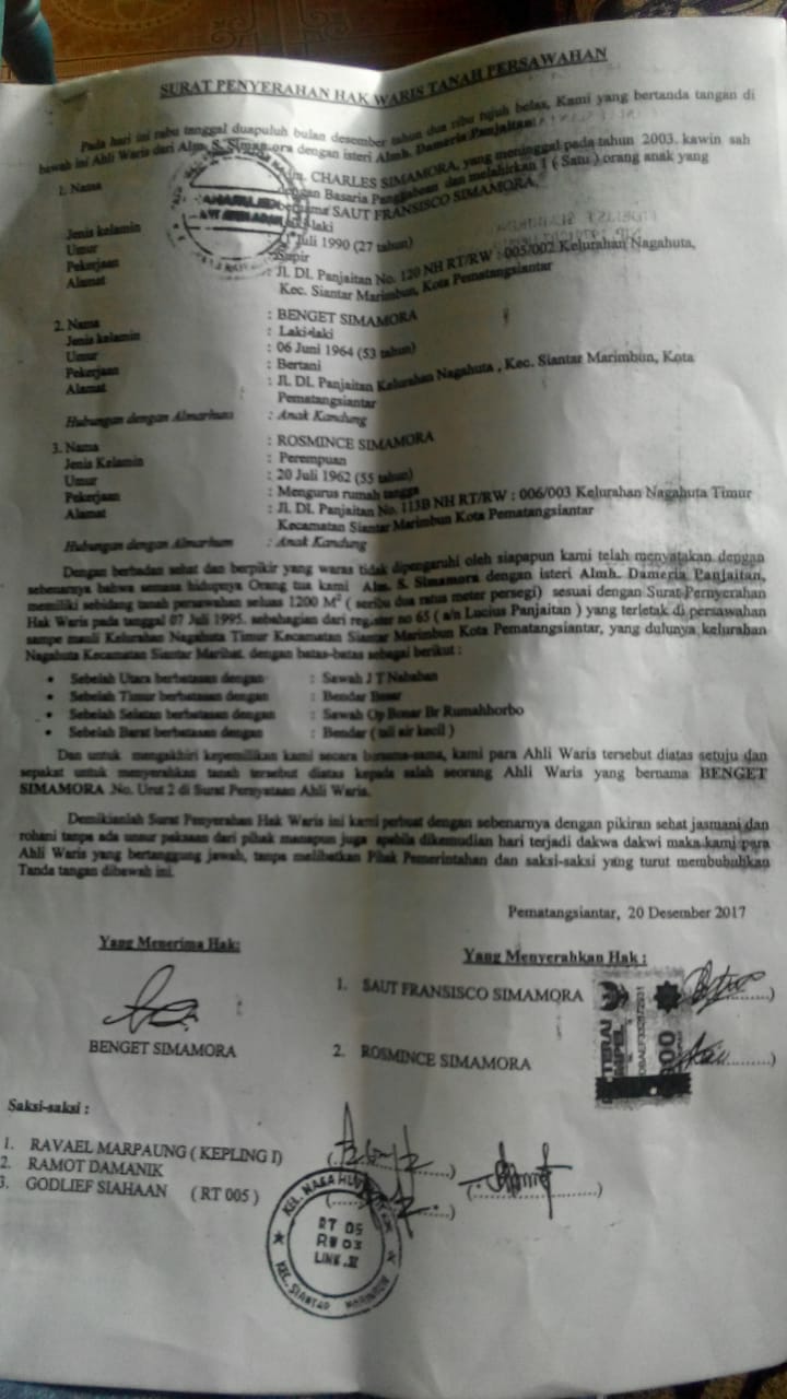 Surat Penyerahan Hak Waris Tanah Persawahan dan Pernyataan Ahli Waris Telah Dipalsukan Tanda Tangan ~ Duta Nusantara Merdeka