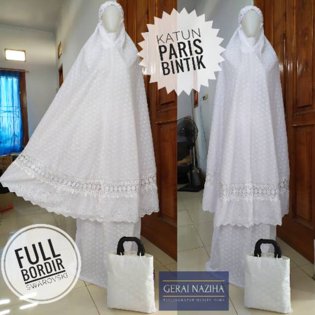 Mukena Dewasa Katun Paris Bentol Bintik Timbul Putih Bersih Full Bordir Renda Kerancang Adem | Shopee Indonesia