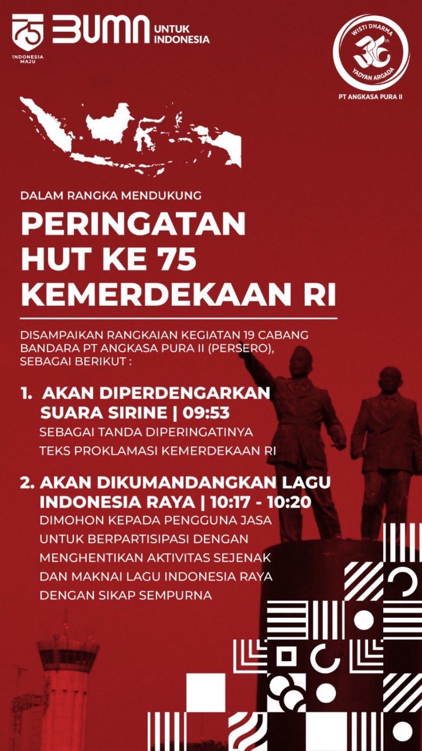 Angkasa Pura II : “Yuk.. ikuti rangkaian kegiatan HUT ke - 75 Kemerdekaan RI di bandara-bandara PT Angkasa Pura II (Persero) Mari memperingati detik Proklamasi dan juga maknai lagu Indonesia