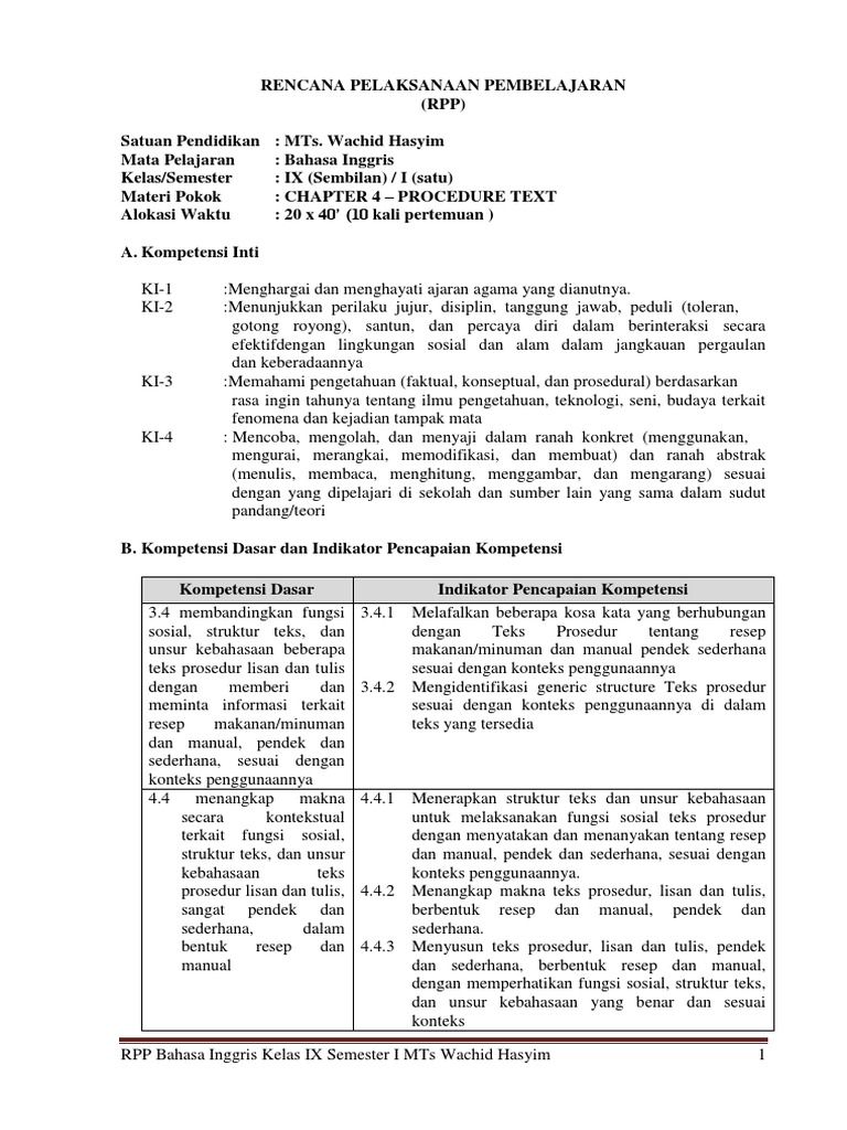 4. RPP Bahasa Inggris Kelas 9 SMP-MTs Semester 1 Materi PROCEDURE TEXT