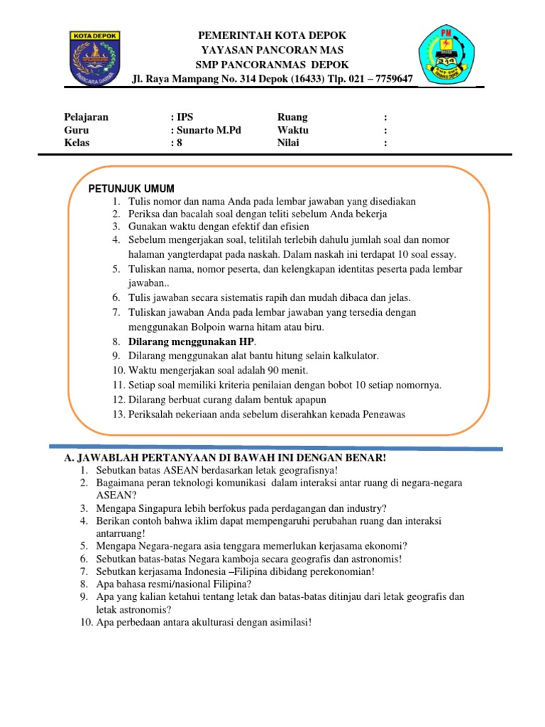 Contoh Soal Ulangan IPS Kelas VIII SMP/MTS Materi Interaksi Keruangan dalam Kehidupan di Negara-Negara ASEAN (ESSAY)