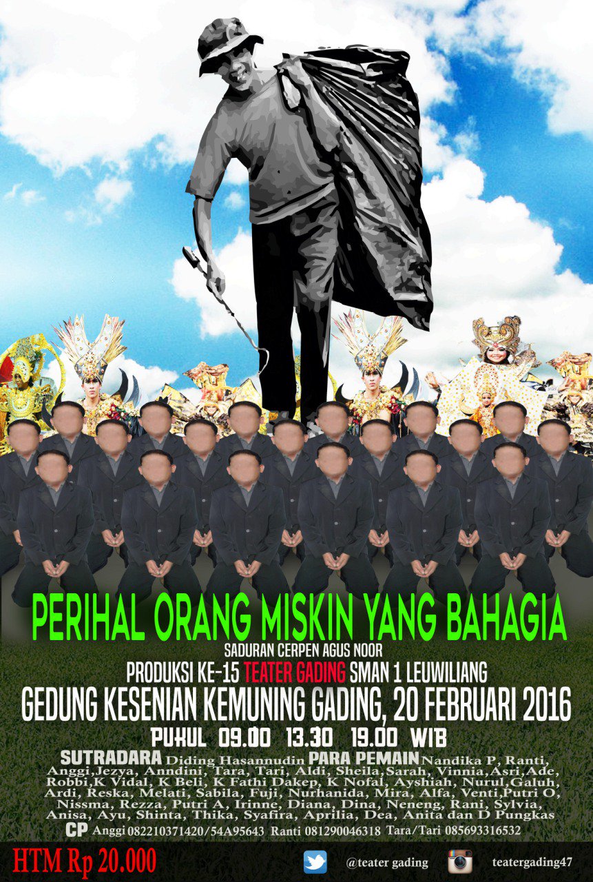 Teater Gading : “SALAM BUDAYA Saksikan Pementasan PERIHAL ORANG MISKIN YANG BAHAGIA Produksi TEATER GADING ke-15 - SMAN 1 LEUWILIANG https://t.co/GEm6HRQaPC”