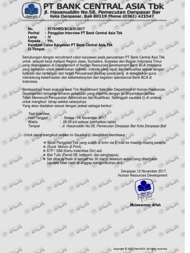Surat Panggilan & Daftar Peserta Interview Kandidat PT Bank Central Asia Tbk.