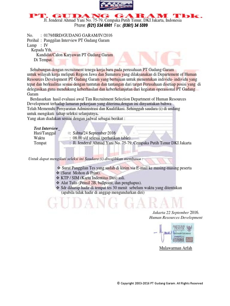 Contoh PeniPuan Surat Panggilan & Daftar Peserta Interview Kandidat PT.gudang Garam Tbk 2019