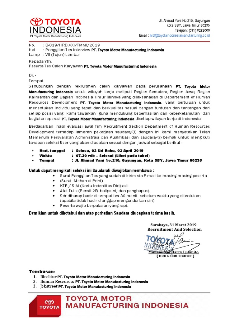 Lampiran Undangan Tes Interview PT. Toyota Motor Manufacturing Indonesia