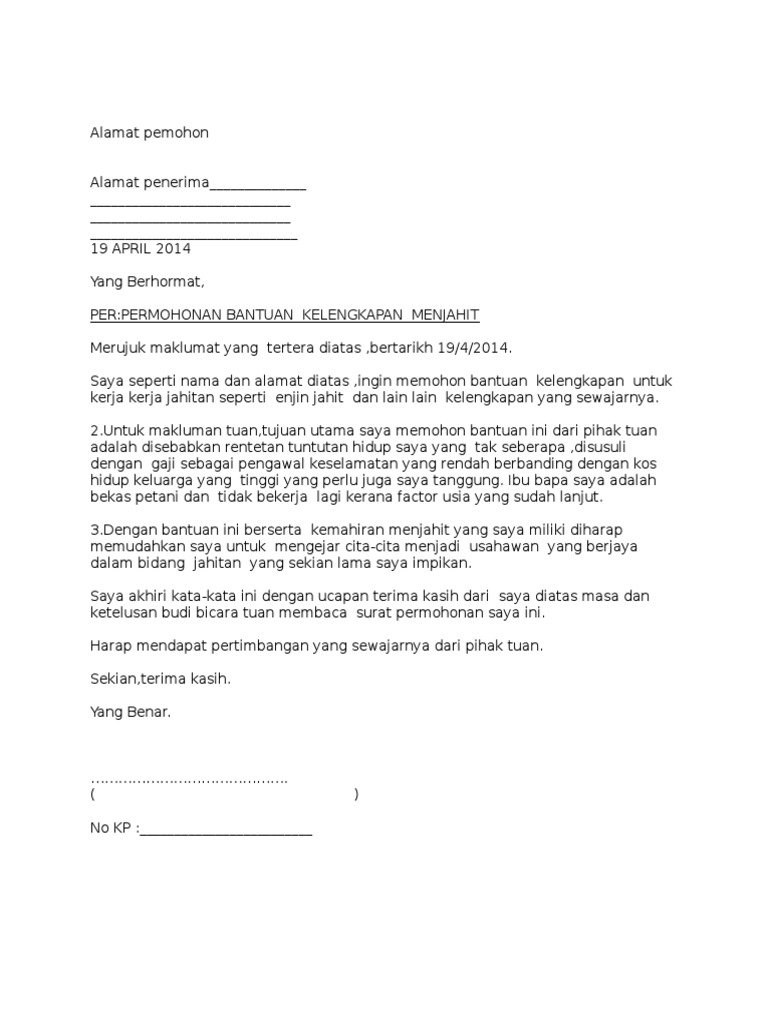 Contoh Surat Rasmi Permohonan Bantuan Mesin Jahit