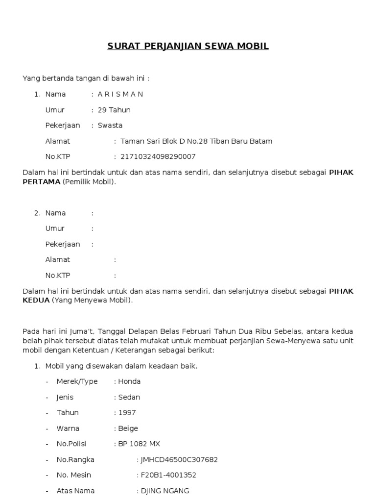 Contoh Surat Perjanjian Sewa Mobil yang Baik dan Benar | Surat, Tanda, Tanggal