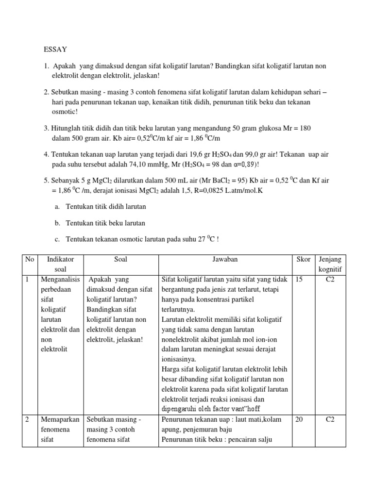 Soal Ulangan ESSAY Sifat Koligatif LARUTAN