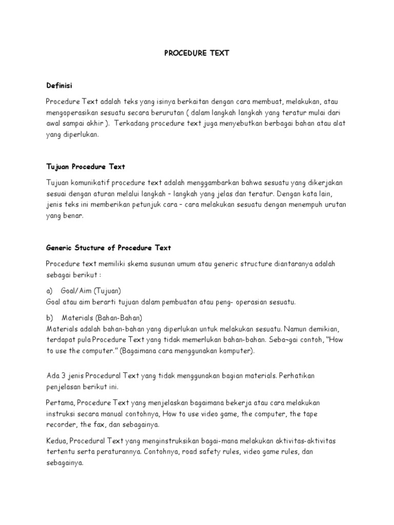 Definisi: Procedure Text adalah teks yang isinya berkaitan dengan cara membuat, melakukan, atau