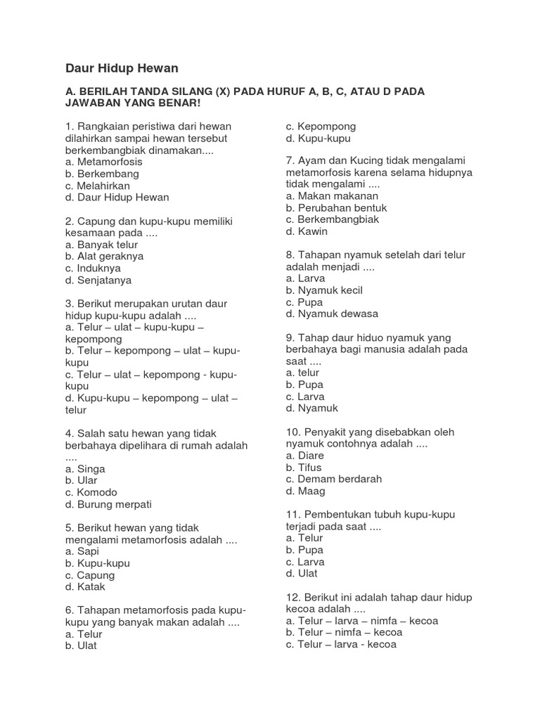 40 Soal Daur Hidup Hewan (IPA) & Jawaban (Essay, Pilgan) - Muttaqin id