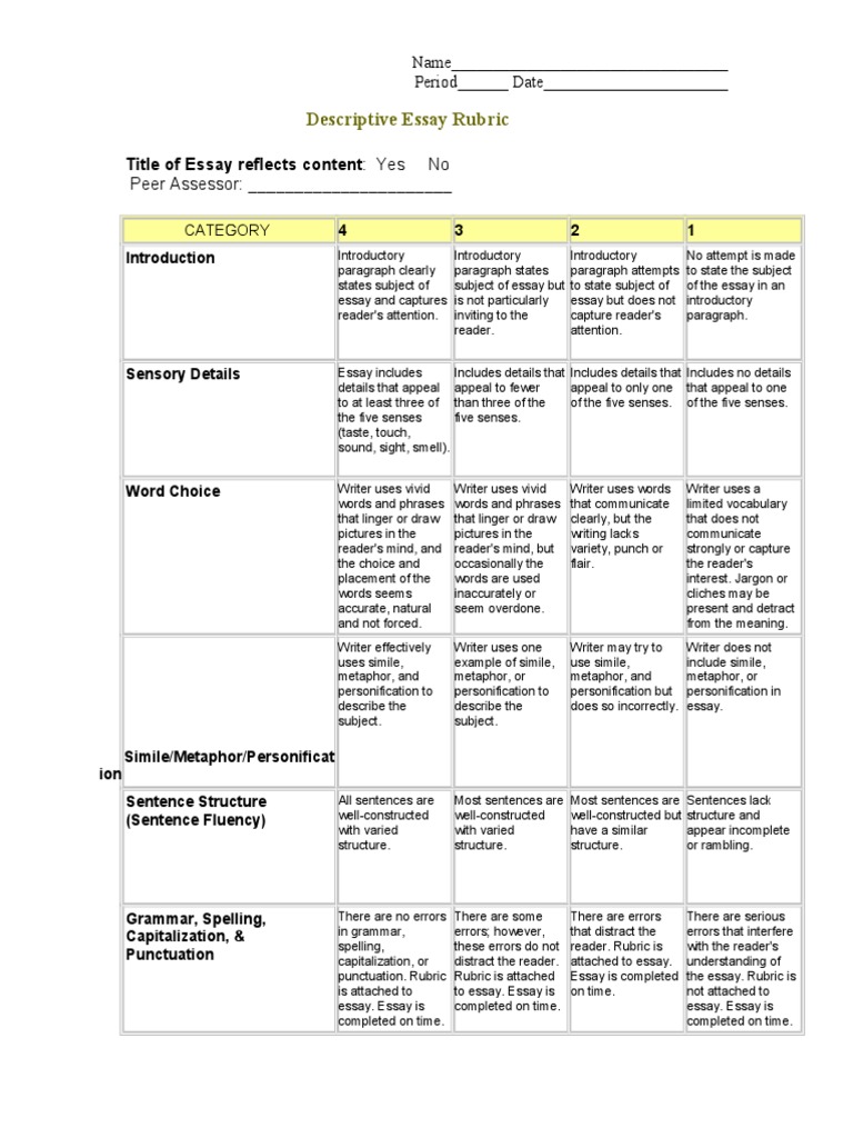 Descriptive Essay Rubric: Title of Essay reflects content: Yes No | Writing | Text