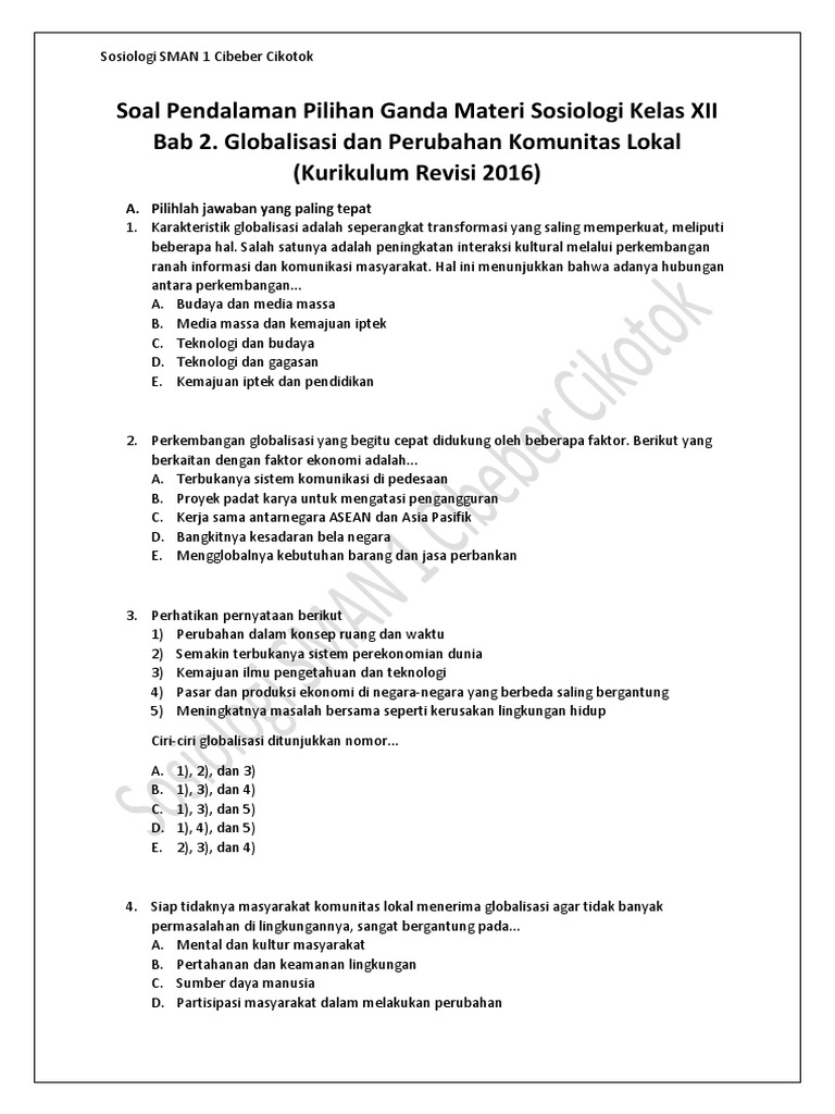 Soal Pendalaman Pilihan Ganda Materi Sosiologi Kelas XII Bab 2. Globalisasi Dan Perubahan Komunitas Lokal (Kurikulum Revisi 2016)