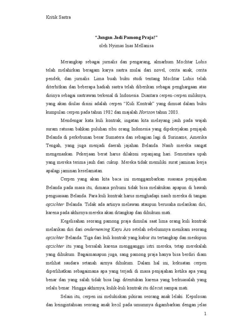 Contoh Kritik Sastra Cerpen Karya Djenar.docx - Contoh Kritik Sastra Cerpen Karya Djenar Kritik sastra adalah tanggapan objektif dari seseorang terhadap | Course Hero