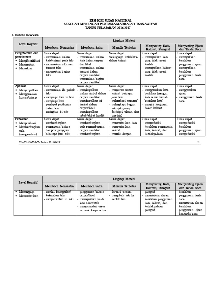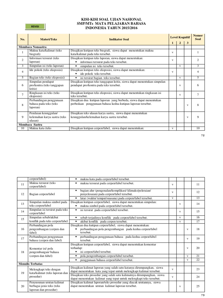 KISI-KISI SOAL UJIAN NASIONAL SMP/MTs MATA PELAJARAN BAHASA INDONESIA TAHUN 2015/2016