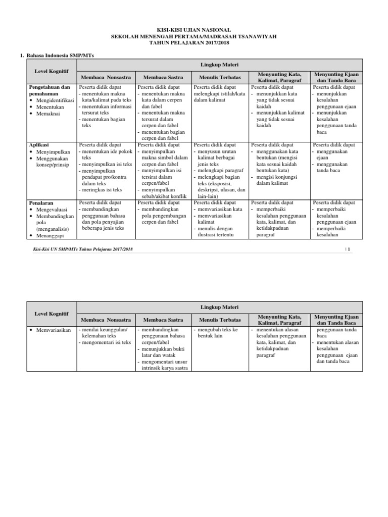 7.pdf - KISI-KISI UJIAN NASIONAL SEKOLAH MENENGAH PERTAMA/MADRASAH TSANAWIYAH TAHUN PELAJARAN 2018/2019 1 Bahasa Indonesia Lingkup Materi Level | Course Hero