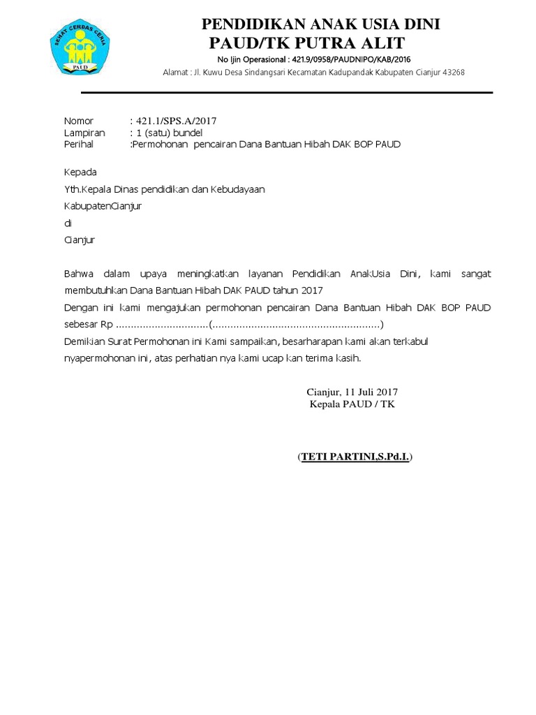 Format Surat Permohonan Pencairan Dana BOP PAUD Tahap I Tahun 2020 ~ Secercah Ilmu