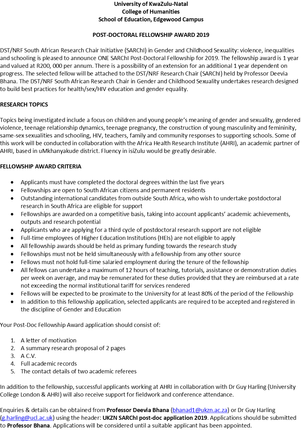 Guy Harling on Twitter: “We seek a postdoc to work with me, Prof Deevia Bhana (https://t.co/eYYgYRwFhd) & colleagues at @AHRI_News in 2019. Qualitative focus on sources of advice, sexuality for adolescents/young adults