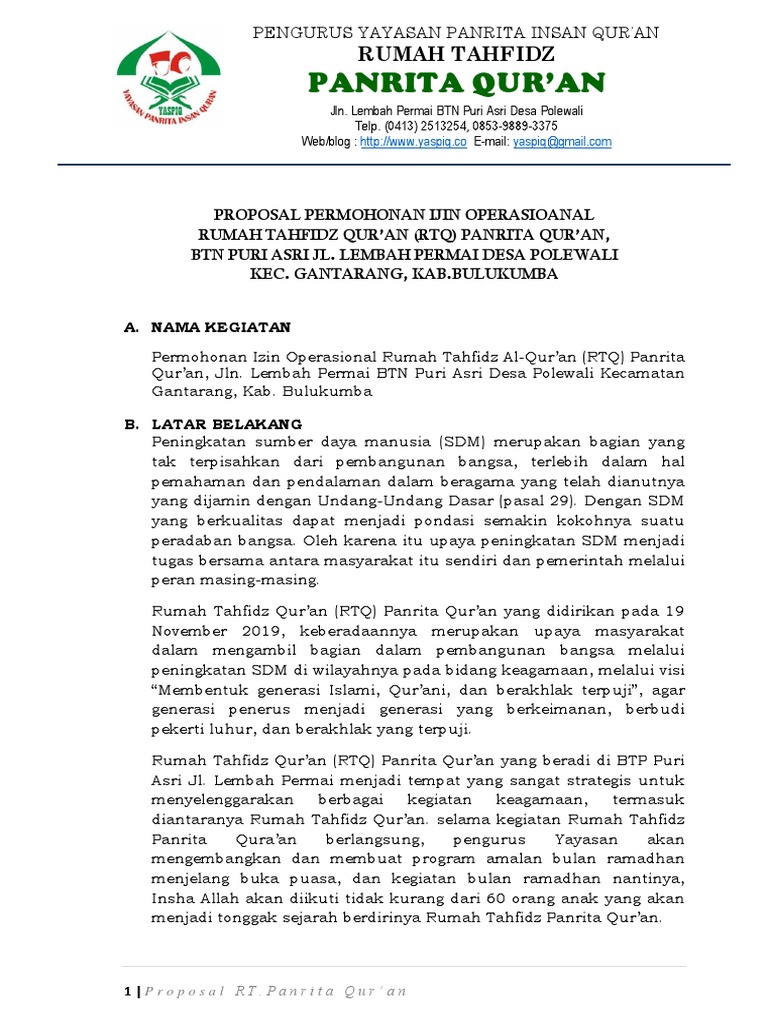 Proposal izin operasional Rumah Tahfidz Qur’an