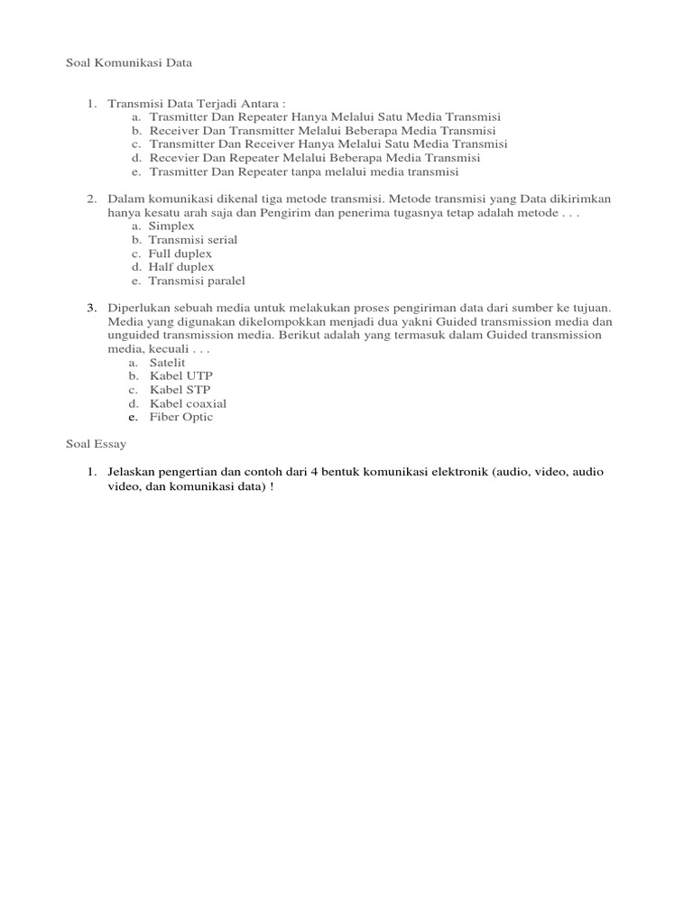 Belajar Komputer Jaringan: SOAL PILIHAN GANDA DAN ESSAY KOMUNIKASI DATA.
