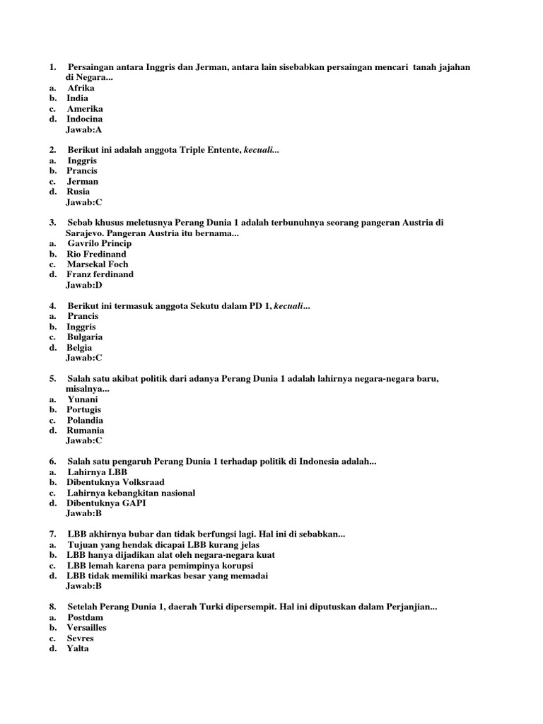 Soal dan Jawaban Perang Dunia I dan Liga Bangsa-bangsa - CekBae
