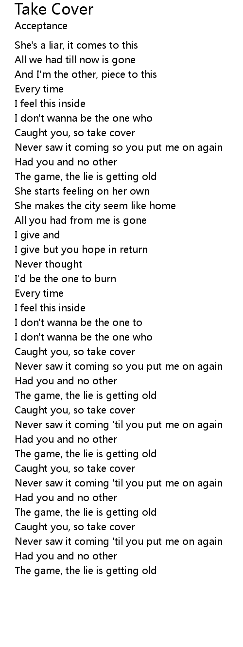 TAKE COVER" LYRICS by ACCEPTANCE: She’s a liar It…