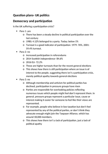 Essay plans for edexcel UK politics paper 1 | Teaching Resources