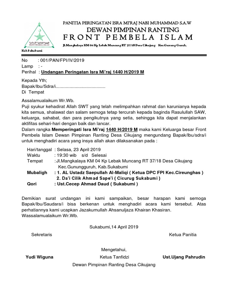 Contoh Surat Undangan Isra' Mi’raj Nabi besar Muhammad SAW 1440 H. ~ Kampung KB “Tumbuh Jaya”